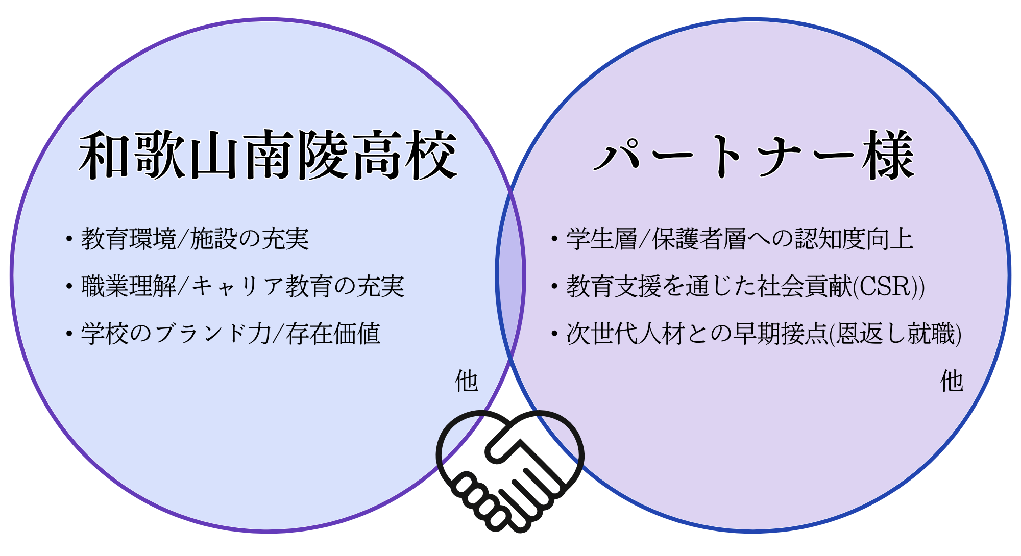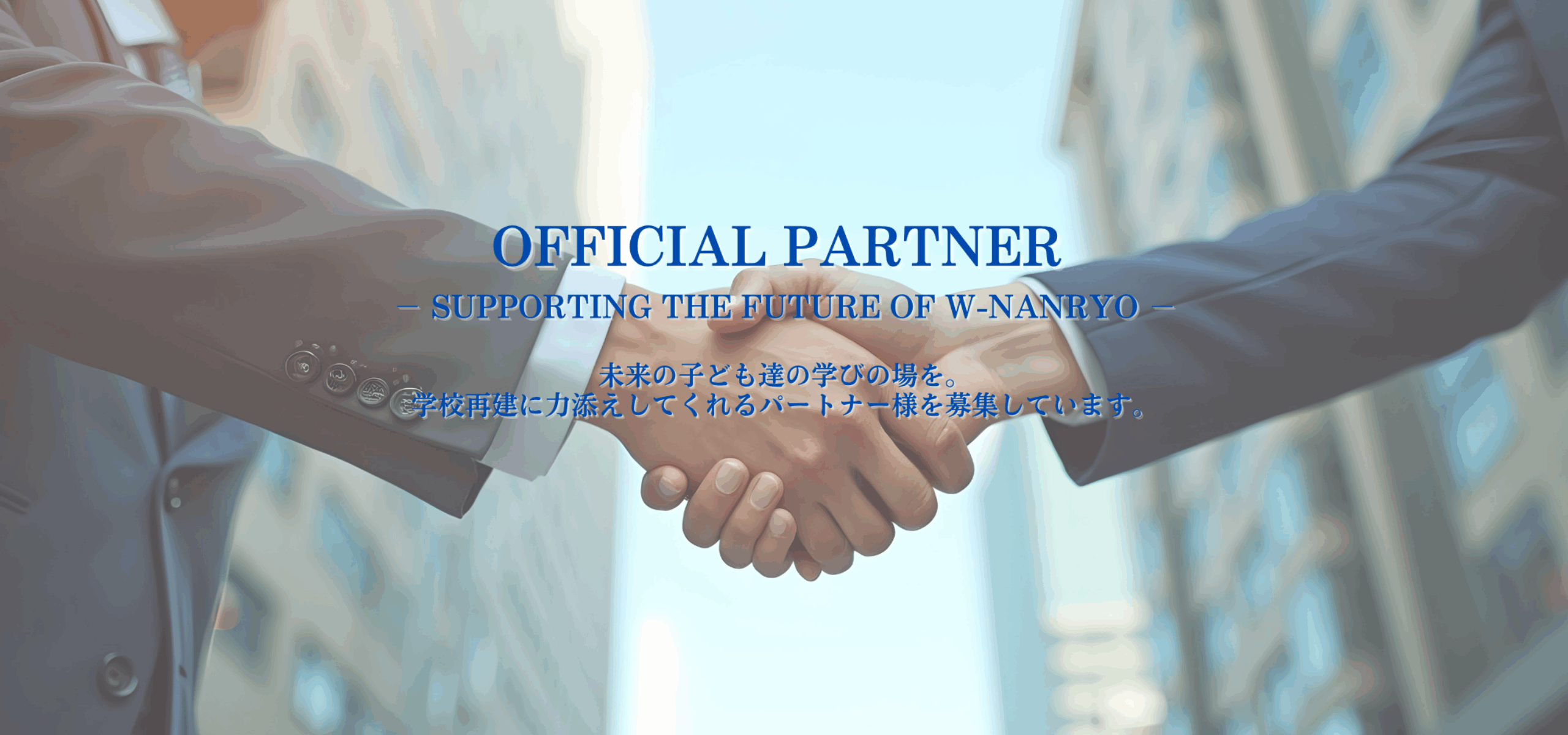 OFFICIAL PARTNER -SUPPORTING THE FUTURE OF EDUCATION-未来の子ども達の学びの場を。学校再建に力添えしてくれるパートナー様を募集しています。”スポンサー募集元年”スポンサー制度を本格的に立ち上げたばかりの和歌山南陵高等学校と一緒に、”創設スポンサー”として 子ども達の未来をつくりませんか? 学校再建プロジェクト 生徒ゼロから「生徒が誇れる学校」を目指す!廃校寸前→「生徒が誇れる学校」を再建する高校SNS×教育 の力で新しい学校の形を発信詳しくはこちらから ・オンラインのメガスタ様と連携し、難関大受験に特化した 通信制サポート校を開校(2025年9月)・オルコネ様(オンライン音楽教室)と連携し、 音楽・楽器が本格的に学べるレッスンの導入(2025年度~)・テレビ番組『ザ!世界仰天ニュース』でも 紹介していただきました ▸ YouTubeで開く※・ふるさと納税寄附金の受付(2025年10月~)※以下、外部サイト(公式YouTube等)に移動します。番組名・ロゴは各権利者に帰属します。 ▸YouTubeで開く. SPONSOR SHIP一方通行の寄付ではない相互メリット型スポンサー制度の実現 SPONSOR SHIP PROGRAM学校と企業が連携することで、教育の質を高めるだけでなく、次世代人材との早期接点やブランド価値の向上、社会貢献の機会など、双方にとって多面的な価値を生み出すことができます。 広報・ブランディング 学校HP、校舎、スクールバス、各イベントで企業名、企業ロゴの掲載 詳しくはこちら 社会貢献活動 子ども達の学びや挑戦をサポートすることで、これからの将来を担う子ども達を応援 詳しくはこちら 学校プロジェクトへの参加 キャリア教育プロジェクトの実施業界や企業の魅力を直接授業する機会の創出 詳しくはこちら 【独自スポンサー制度】KOUKOU 子ども達の学びや挑戦をサポートすることで、これからの将来を担う子ども達を応援 詳しくはこちら Official Partners現在スポンサーシップを結んでいるパートナー様 企業スポンサー様オール九州セキュリティ株式会社様MASA株式会社様アモシスジャパン株式会社様株式会社山本スクラップ様ヤマホ工業株式会社様 大江テント工業様 株式会社たにぐち様御坊自動車学校様 紀州ファスナー株式会社様 株式会社シトラスファーマシー様 ゆーみーペイント様 個人スポンサー様サンエスプラニング様劇団千の朝日・廣川潤季様尾崎 新様武田 努様濱 真司様浜本 未来様東 睦子様畑中 公平様高瀬 一郎様 ▸ YouTubeで開く 和歌山南陵高等学校広報関東本部お気軽にご相談下さい ご応募・お問い合わせ スポンサー募集 お問い合わせ窓口(学校公認)▸株式会社親心アップソリューションズ住所:埼玉県さいたま市大宮区桜木町1-195-1 大宮ソラミチKOZ4階電話:048-783-7520(代表) ※11時~18時受付HP:https://shinshin-shoseki.co.jp/ ※スポンサー募集に関するご連絡は左記の当社窓口までお願いいたします和歌山南陵高等学校住所:和歌山県日高郡日高川町和佐2223-5HP:https://w-nanryo.ed.jp/